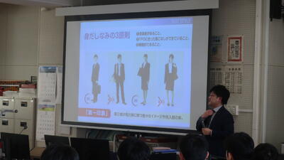 3年情報マネジメント科の総合実践の授業において、青山商事株式会社滝川店長を講師として招聘し、「ビジネスマナー&スーツ着こなし講座」についての講話を行いました。高校卒業後の新生活に向けて、成人としてのマナーやスーツの着こなしについての知識をご教授いただきました。代表生徒4名がモデルとしてスーツに着替え、実演を踏まえてご説明いただきました。