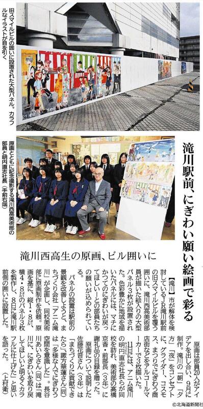 【美術部】旧スマイルビルの仮囲いデザイン 投稿日時 : 11/18 ホームページ担当 本校美術部が、旧スマイルビルの仮囲いの一部をデザインをさせていただきました。 街の賑わいをテーマに3枚の原画を作成し、このたびのパネル設置となりました。 お近くをお通りの際は、是非ご覧ください。 報道記事も併せてご覧ください。 北海道新聞社許諾D2511-2611-00030580 タグ 報道
