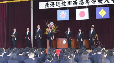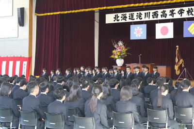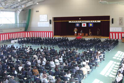 4月8日(水)に令和8年度入学式を挙行しました。ご来賓とたくさんの保護者にご参列いただき、215名の新入生を迎えました。校長式辞に続き、ご来賓に祝辞をいただいた後、新入生代表による宣誓、吹奏楽局員による校歌紹介を行いました。入学式終了後には、担任団紹介と学年主任による挨拶がありました。